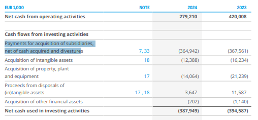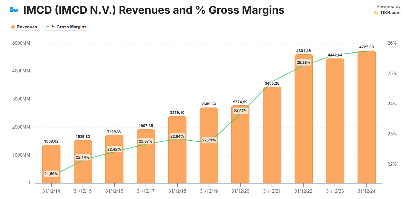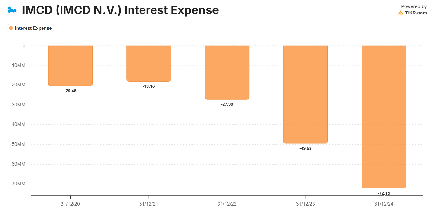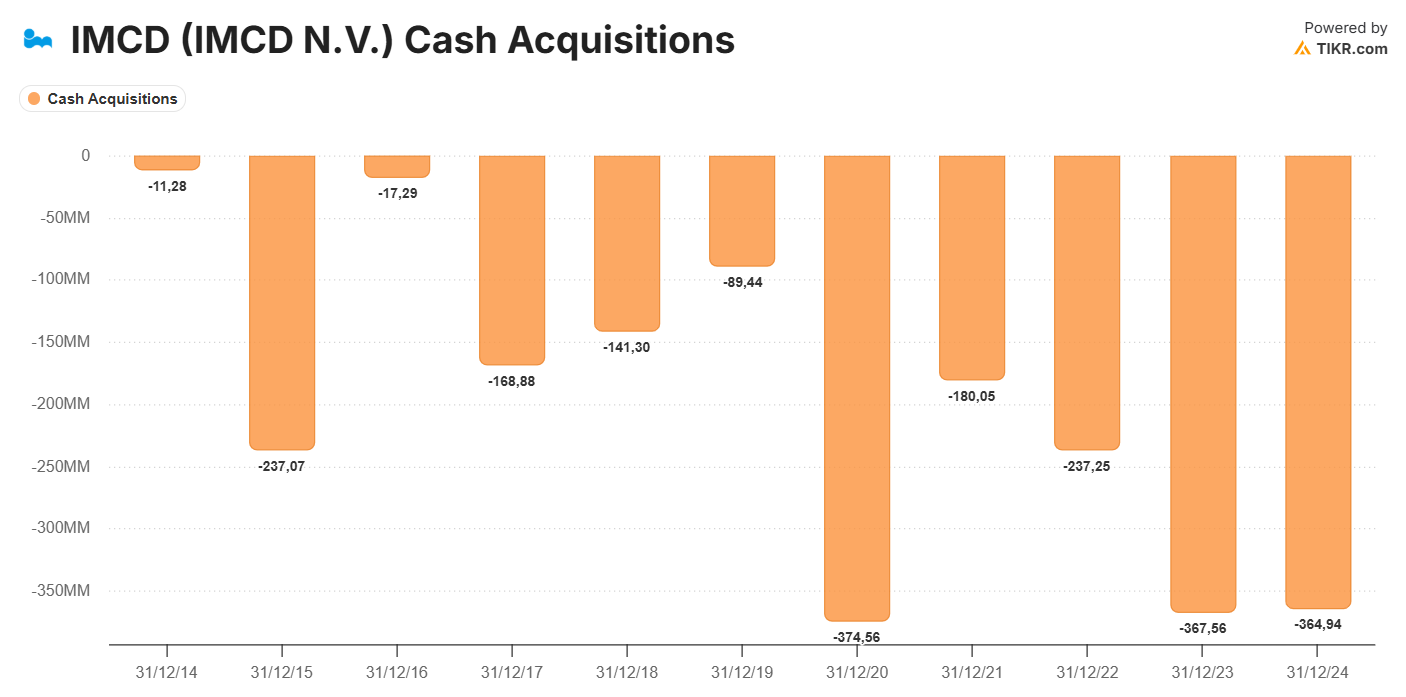 Podemos, también usando TIKR verificar cómo estos dos años donde la empresa ha dedicado unos 360 millones de euros a adquirir compañías, no son tan especiales. Es habitual que IMCD haga adquisiciones cada año. El año 2025 ha estado en línea con el 2024 también.