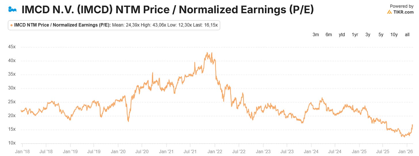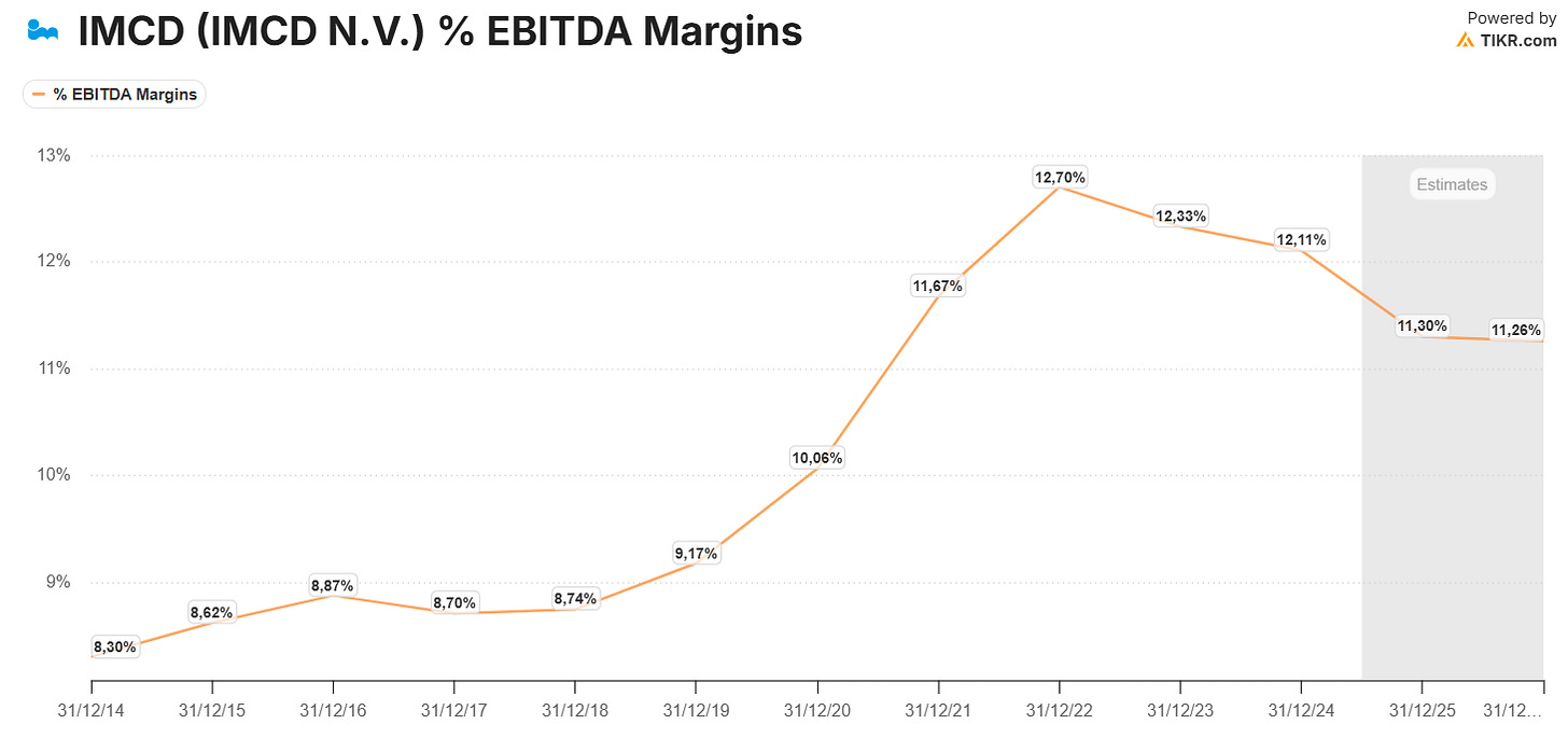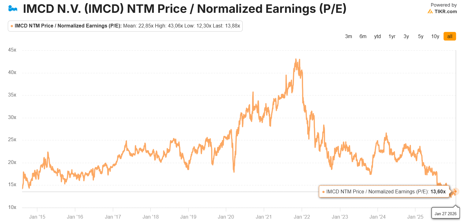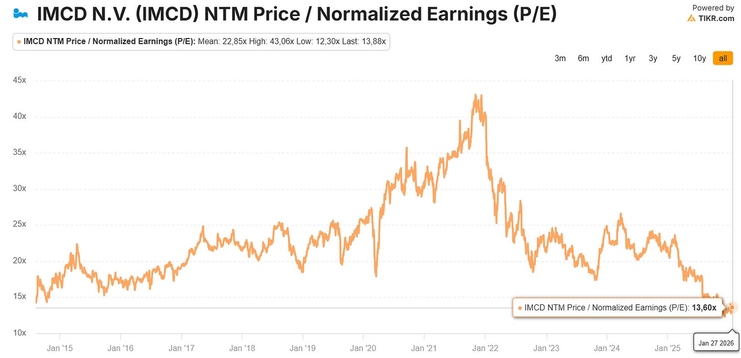 IMCD es el tipo de compañía que suele cotizar históricamente por encima de los múltiplos de las adquisiciones que realiza. Es bastante evidente pensar que, si en este sector, las empresas pequeñas se venden por 16 veces sus beneficios, las más grandes, que tienen más escala y están consolidando el sector, valgan bastante más.