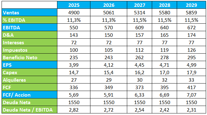 El margen EBITDA sobre ventas, ya hemos visto que estaba sufriendo. Suponemos que sigue bajando y se estabiliza por debajo de lo que tenía en 2021, cuando empezó la distorsión. Luego puede recuperarse algo al seguir ganando escala, pero no llega a lo que tuvo en los años 2022 y 2023.