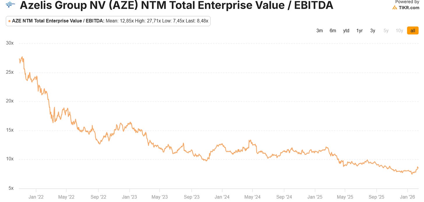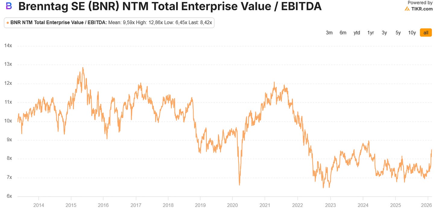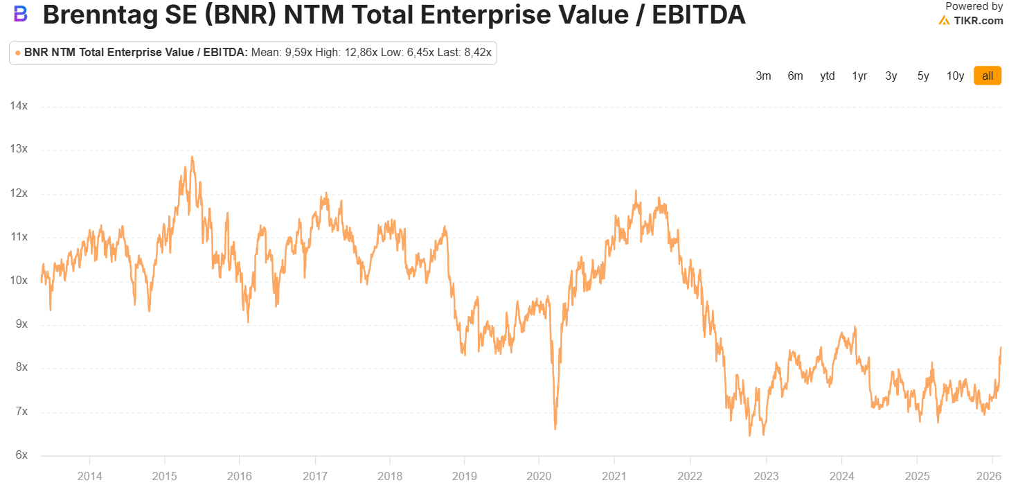 Suele cotizar a múltiplos por tanto más bajos que IMCD, pero el gráfico de la evolución de su múltiplo EV/EBITDA, nos puede dar una idea del pesimismo generalizado que hay sobre este tipo de empresas distribuidoras: