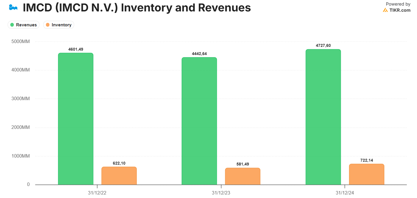 En realidad, como veremos, un poco menos ya que ha emitido algunas acciones para financiar adquisiciones. Pero a cambio, ha tenido cierto consumo de caja extra porque ha aumentado de forma importante el nivel de inventarios. Se puede ver cómo, en los últimos tres años, los inventarios se han acumulado y son algo más altos que en 2022, con una facturación que apenas ha crecido desde entonces.