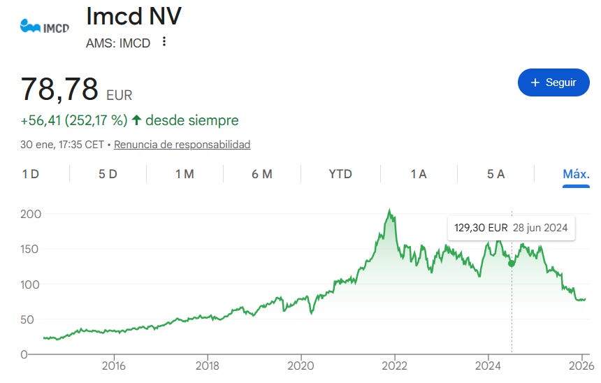 Siendo sincero, esta tesis molaba más cuando se empezó a escribir hace unos días e IMCD cotizaba a 75 euros. Pero se ha ido últimamente a 90 más o menos. Aún así, desde 90 a 130 hay un buen trecho y una rentabilidad interesante si se cumple a 4 años vista. Y habría que añadir el dividendo.