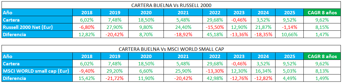 Utiliza su cartera personal como un diversificador, y no se preocupa tanto de si bate al mercado con ella o no. Le gusta que aporte cierta descorrelación, pero sin descuidar un buen rendimiento. No obstante, a muy largo plazo, piensa que su cartera batirá al mercado porque las small caps llevan diez años dando muy mal resultado, y le gusta tener esa exposición.