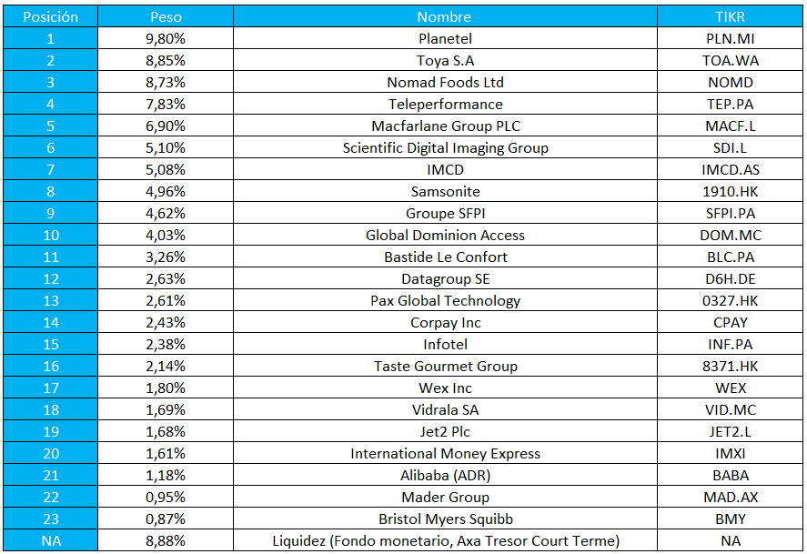 Investigando y siguiendo las directrices del Sr. Miyagi, encontró a AZ Valor, Cobas, Magallanes y Horos. Valentum y True Value también entraron, para incrementar la exposición a pequeñas compañías y aportar algo de otro estilo.