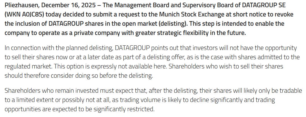 Nota: Aunque ahí aparezca Datagroup, porque estaba presente en el cierre de año, en realidad la posición ha sido completamente liquidada unos días después. El motivo es que los principales accionistas han comenzado el proceso para intentar deslistarla —excluirla de cotización— incluso cuando controlan menos del 70%. Hace un tiempo cambiaron su cotización a un mercado menos regulado, y era una posibilidad que preocupaba al Sr. Miyagi. Aunque no sé lo que va a ocurrir al final, si la petición será aceptada o no, en estos casos es mejor vender rápidamente para evitar quedarse con acciones que quizá un día cercano no se puedan negociar. Vendido el 100% a 70 EUR, durante la primera semana de 2026.