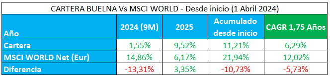 Desde el inicio de estas publicaciones, en Abril de 2024, la cartera ha tenido una rentabilidad anualizada del 6,29%, frente a un 12,02% del mercado, en un plazo que aún no llega a dos años.