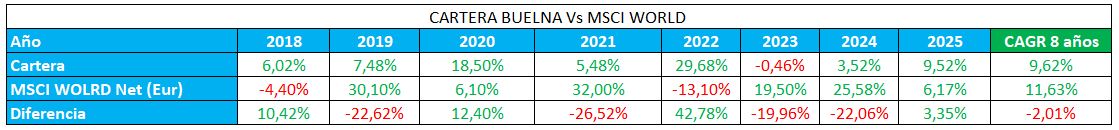 La cartera, medida en euros, y contando con la reinversión de los dividendos, como siempre, ha arrojado una rentabilidad del 9,52% en 2025.