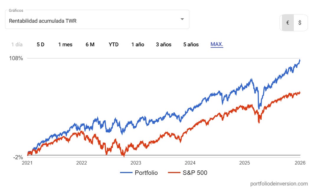 La rentabilidad de esa combinación —excluyendo la cartera personal primero para simplificar el cálculo— acumulada a lo largo de 5 años, es cercana al 107%. Aquí la tenemos comparada contra el SP500 (ojo, este último sin reinvertir dividendos. No sirve para comparar)